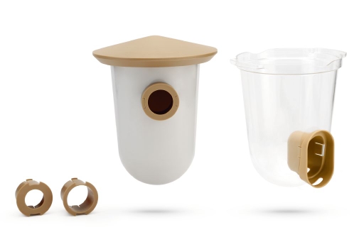 De Signing Friend Set is een modieuze en eigentijdse set voor vogels, bestaande uit een voersilo en een broedhuisje. Zowel de voersilo als het broedhuisje kunnen op verschillende manieren worden bevestigd. Zo kunnen beide onderdelen aan de muur worden bevestigd door middel van een schroef of aan bijvoorbeeld een regenpijp op schutting, met het meegeleverde klittenband. Zodra de onderdelen zijn gemonteerd, kun je deze gemakkelijk bijvullen of schoonmaken. Je draait de silo of het broedhuisje een slag en vervolgens komt deze los van het dakje. Uiteraard kun je de silo of het broedhuisje daarna ook weer gemakkelijk terughangen door deze tegen het dakje aan te houden en wederom een slag te draaien. Het dakje en de voeropening zijn beide waterdicht. – Gemaakt van plastic – Inclusief dakje, voersilo, broedhuisje, klittenband en 3 ringen met verschillende diameters